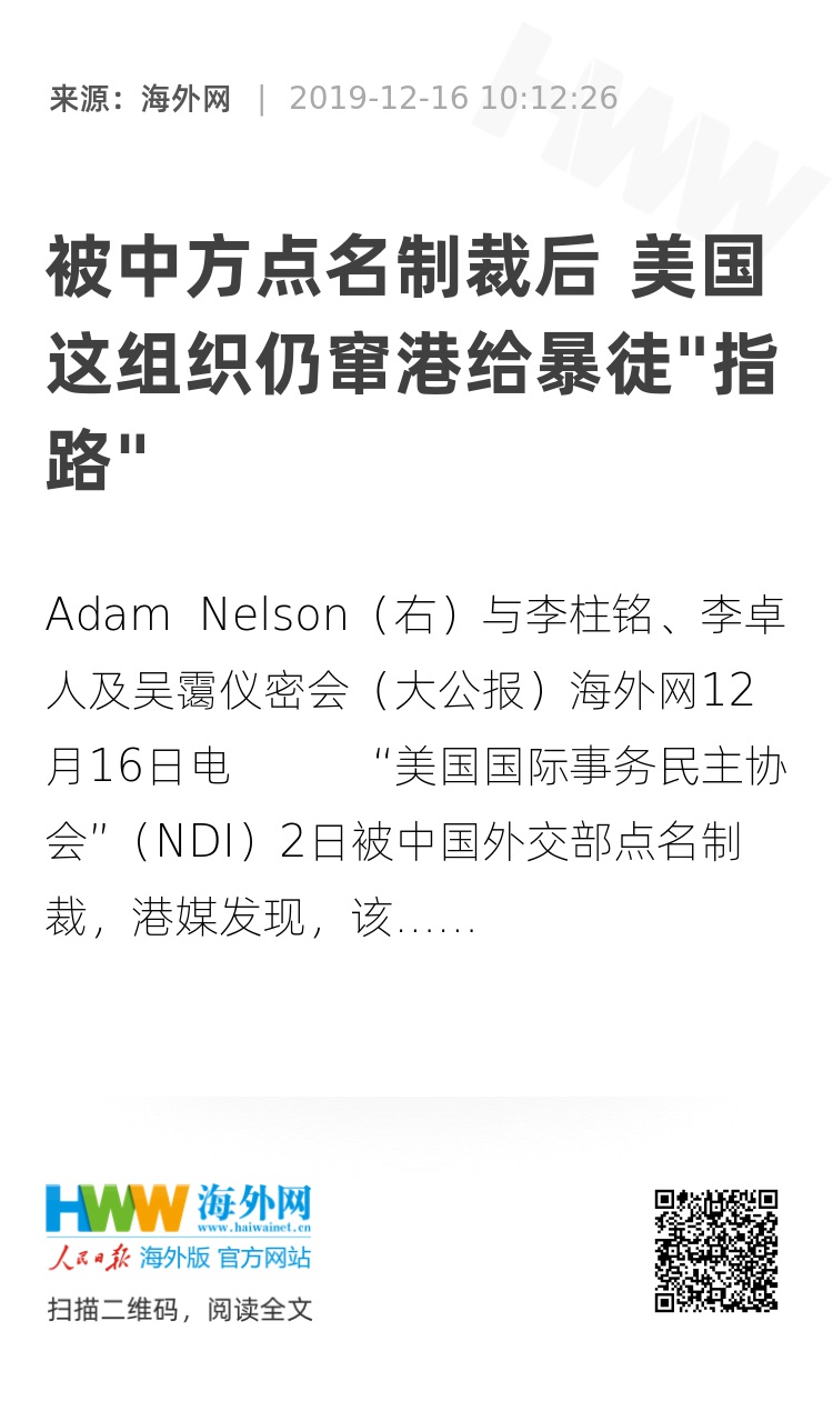 中国外交部12月2日宣布对“美国国家民主基金会”(NED)、“美国国际事务民主协会”(NDI)等在香港修例风波中表现恶劣的非政府组织实施制裁。而根据《大公报》16日发表的调查报道,NDI亚洲区高级项目经理Adam Nelson近日又“大摇大摆”窜港,在香港中环一间酒店,与李柱铭、李卓人及吴霭仪等纵暴政棍会面,商讨NDI被制裁后,如何继续支持泛暴派“两条腿走路”,即“继续走国际路线”及调整乱港策略。