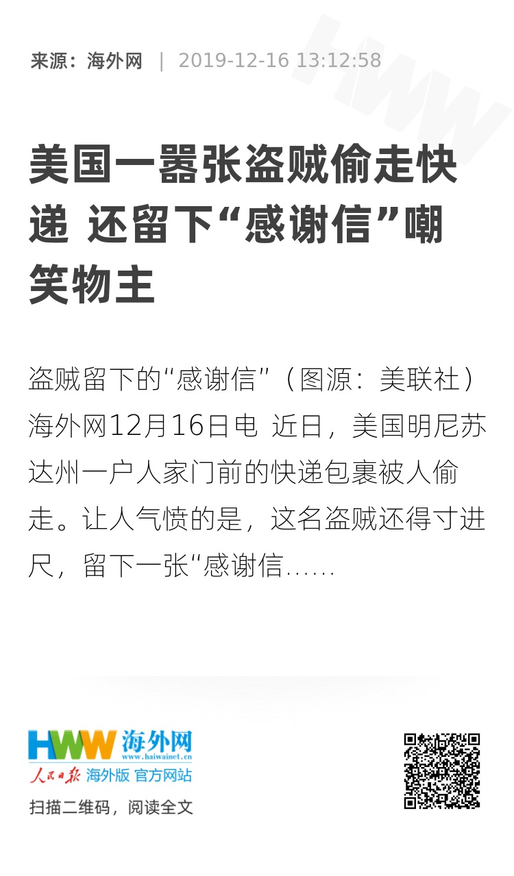 海外网12月16日电 近日,美国明尼苏达州一户人家门前的快递包裹被人偷走。让人气愤的是,这名盗贼还得寸进尺,留下一张“感谢信”嘲讽物主,还将自己比作是“包裹的新主人”。
