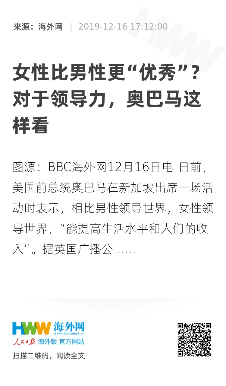 据英国广播公司(BBC)网站16日报道,奥巴马近日前往新加坡,参加了一场有关领导力的私人活动。在活动中,他公开表达了对于男性领导者与女性领导者的相关看法。