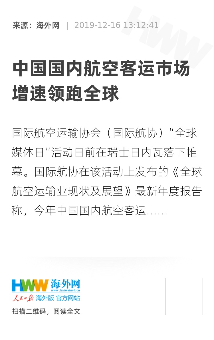 报告显示,2019年,全球航空运输业净利润达到259亿美元,客运量为45.4亿人次,货运量为6120万吨。这是全球航空运输业连续第十年盈利。其中,中国国内航空客运市场同比增长8.5%,在全球航空客运市场中名列榜首。报告预计,2020年全球航空运输业持续向好,预期净利润将达到293亿美元。
