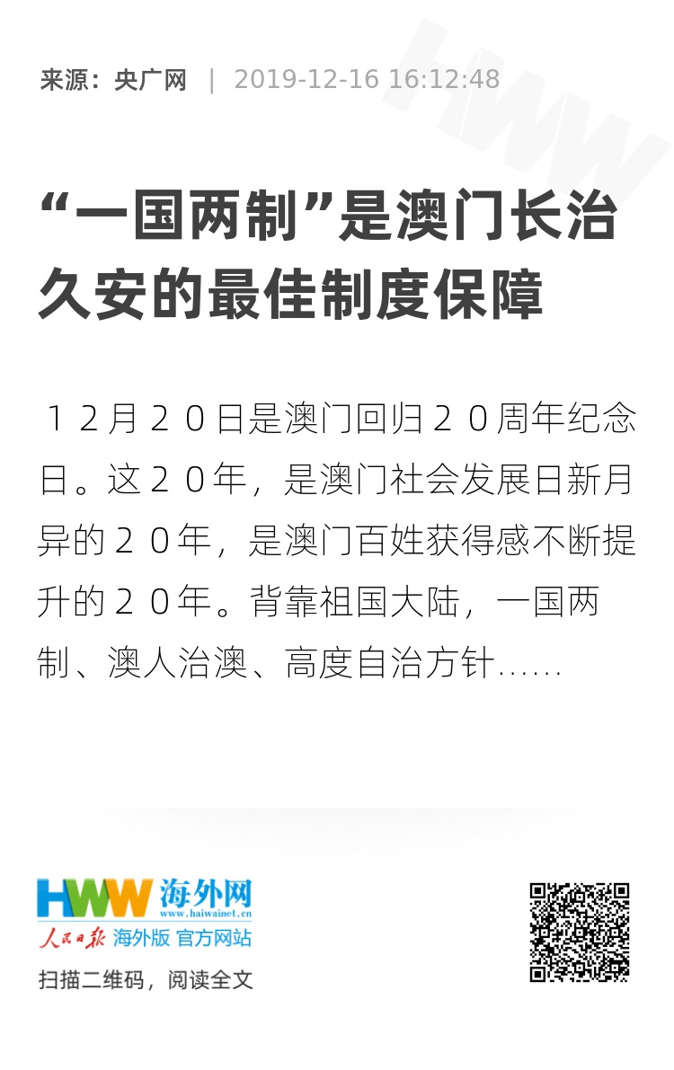 回归20年,是澳门融入国家发展大局、共享祖国繁荣富强的真实写照,“路子对、政策好、身段灵、人心齐”,是澳门实现经济更稳、民生更实、法治更强的最佳注解。澳门的经验证明,坚决维护宪法和基本法权威,坚决贯彻实施好“一国两制”是实现澳门长治久安的最佳制度安排,也是中国解决历史遗留问题、实现国家和平统一的最佳方式。(卜卫军)