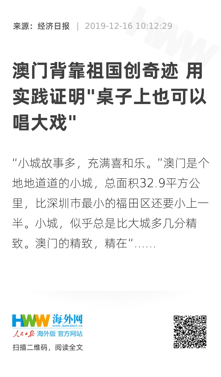 今日澳门,雄姿英发,风华正茂。全世界经济增速最快的地区之一,人均GDP全世界最高的地区之一——背靠祖国,把握祖国所需,发挥自身所长,精致的澳门创造了令全世界瞩目的“澳门奇迹”。像习近平主席在澳门回归15周年时所讲的那样:“澳门回归祖国15周年的实践证明,只要路子对、政策好、身段灵、人心齐,桌子上也可以唱大戏。”(经济日报-中国经济网记者 王玥)