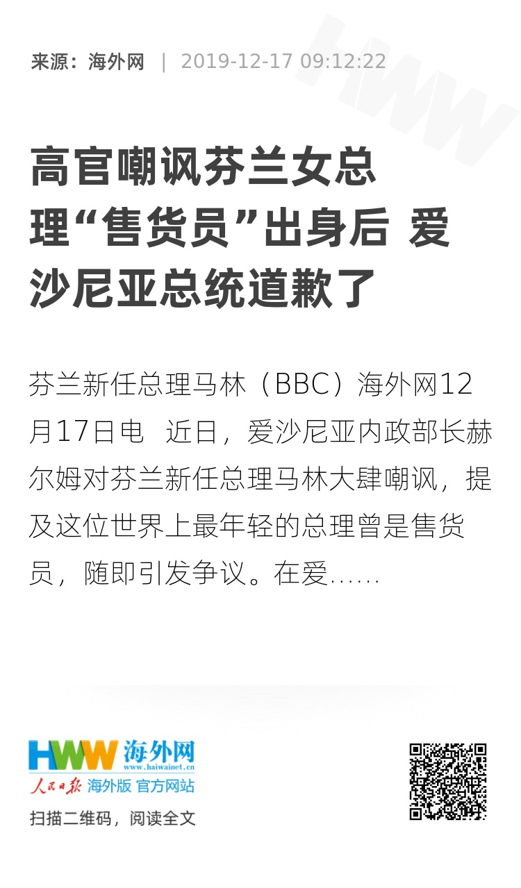 海外网12月17日电 近日,爱沙尼亚内政部长赫尔姆对芬兰新任总理马林大肆嘲讽,提及这位世界上最年轻的总理曾是售货员,随即引发争议。在爱沙尼亚总理急忙出来“灭火”,称“芬兰是我们的亲密朋友和伙伴”后,该国总统也站了出来,向芬兰方面道歉。