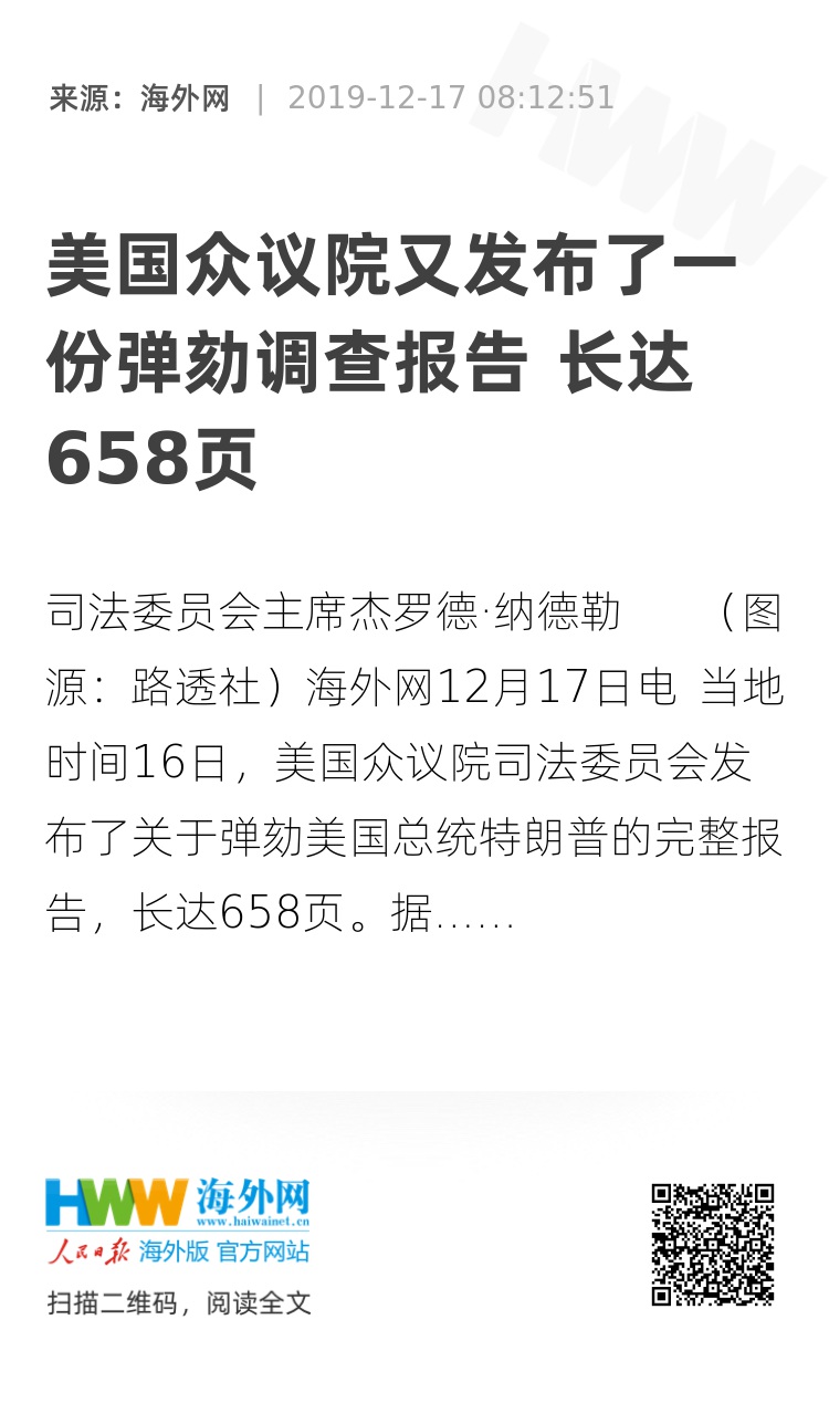 海外网12月17日电 当地时间16日,美国众议院司法委员会发布了关于弹劾美国总统特朗普的完整报告,长达658页。