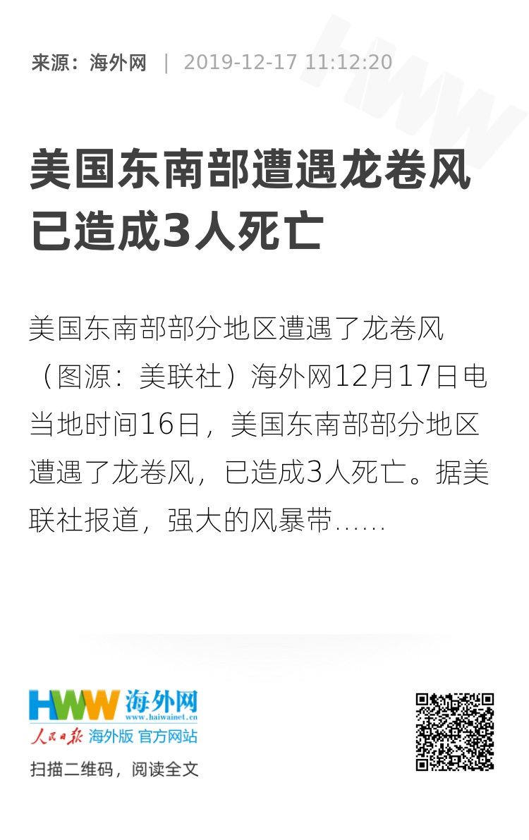 海外网12月17日电 当地时间16日,美国东南部部分地区遭遇了龙卷风,已造成3人死亡。