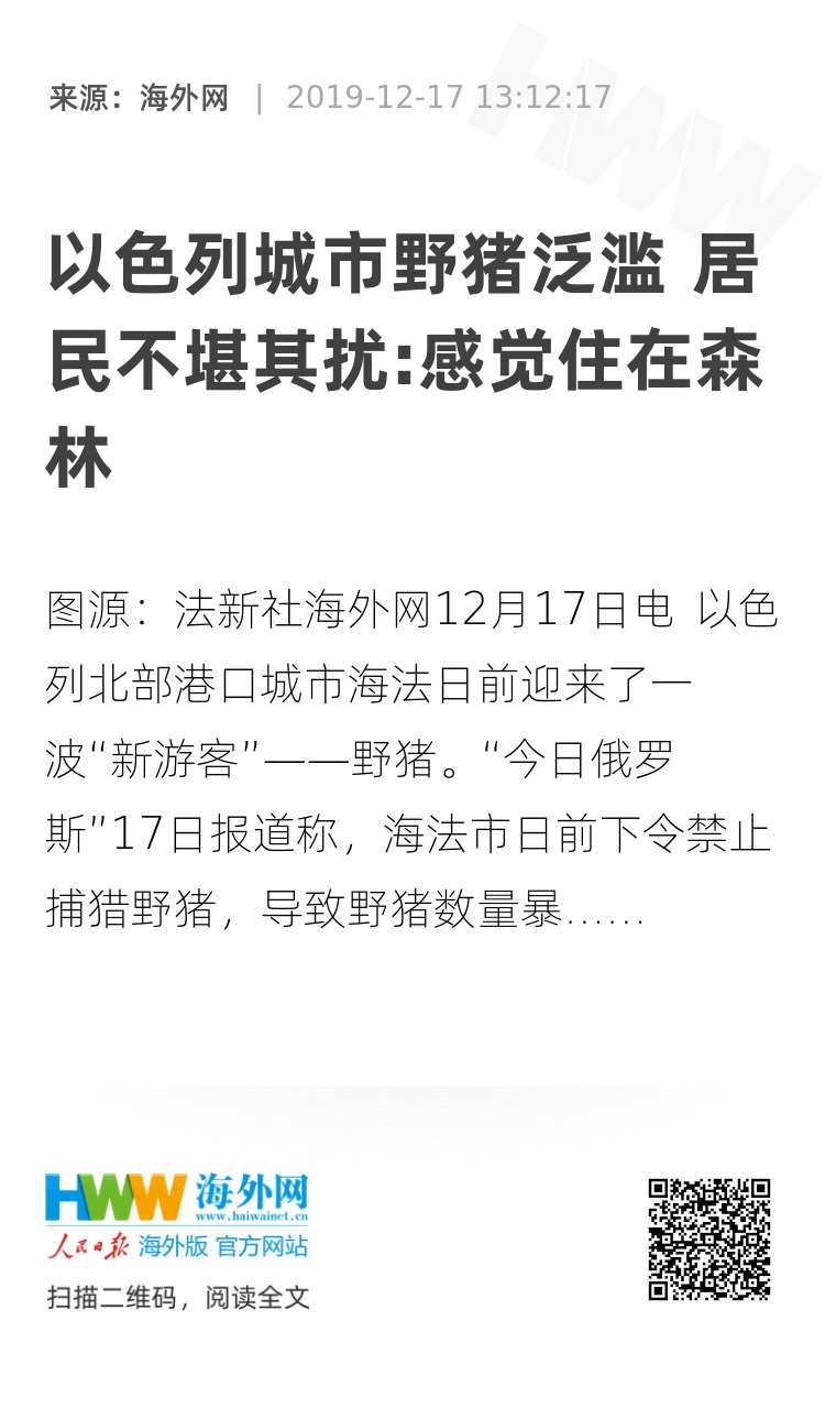 海外网12月17日电 以色列北部港口城市海法日前迎来了一波“新游客”——野猪。“今日俄罗斯”17日报道称,海法市日前下令禁止捕猎野猪,导致野猪数量暴增,甚至威胁当地居民安全。