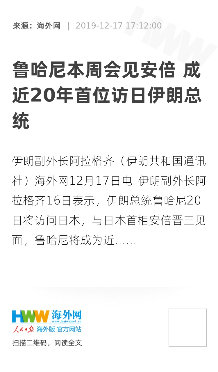 海外网12月17日电 伊朗副外长阿拉格齐16日表示,伊朗总统鲁哈尼20日将访问日本,与日本首相安倍晋三见面,鲁哈尼将成为近20年来首位访问日本的伊朗总统。
