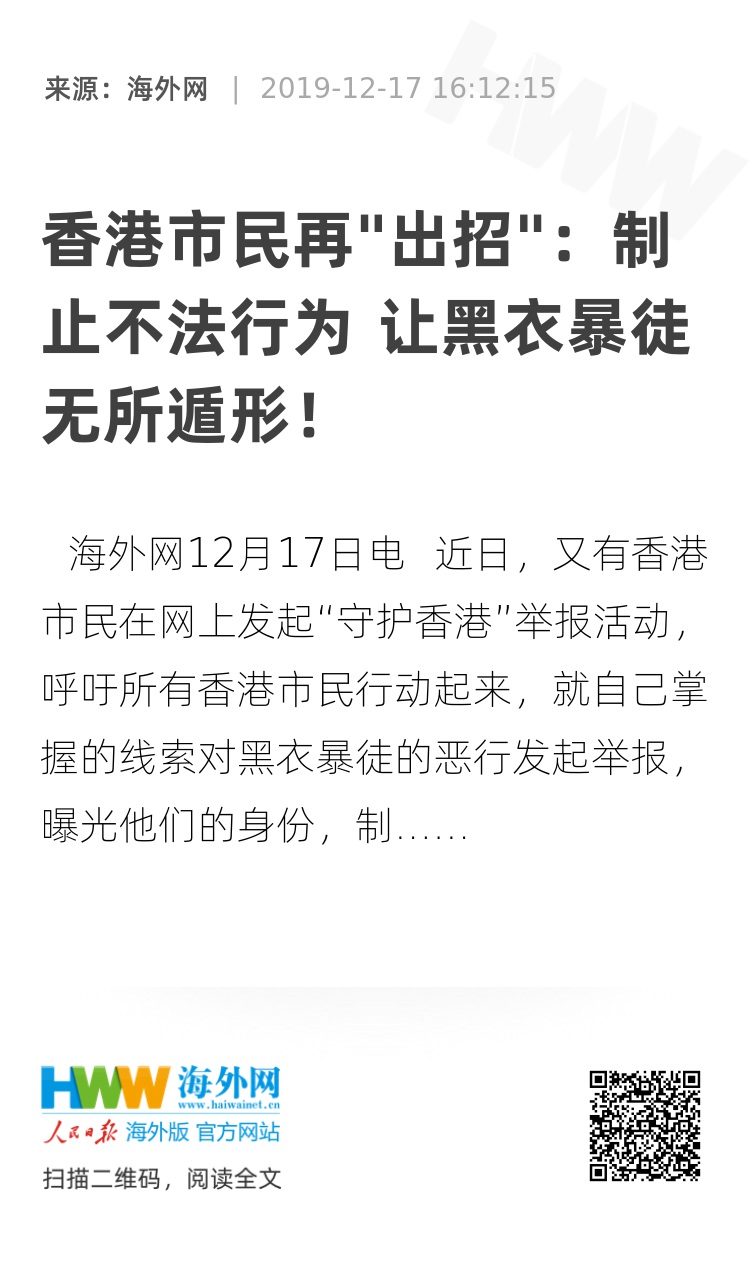 海外网12月17日电 近日,又有香港市民在网上发起“守护香港”举报活动,呼吁所有香港市民行动起来,就自己掌握的线索对黑衣暴徒的恶行发起举报,曝光他们的身份,制止不法行为,让所有的黑衣暴徒无所遁形。