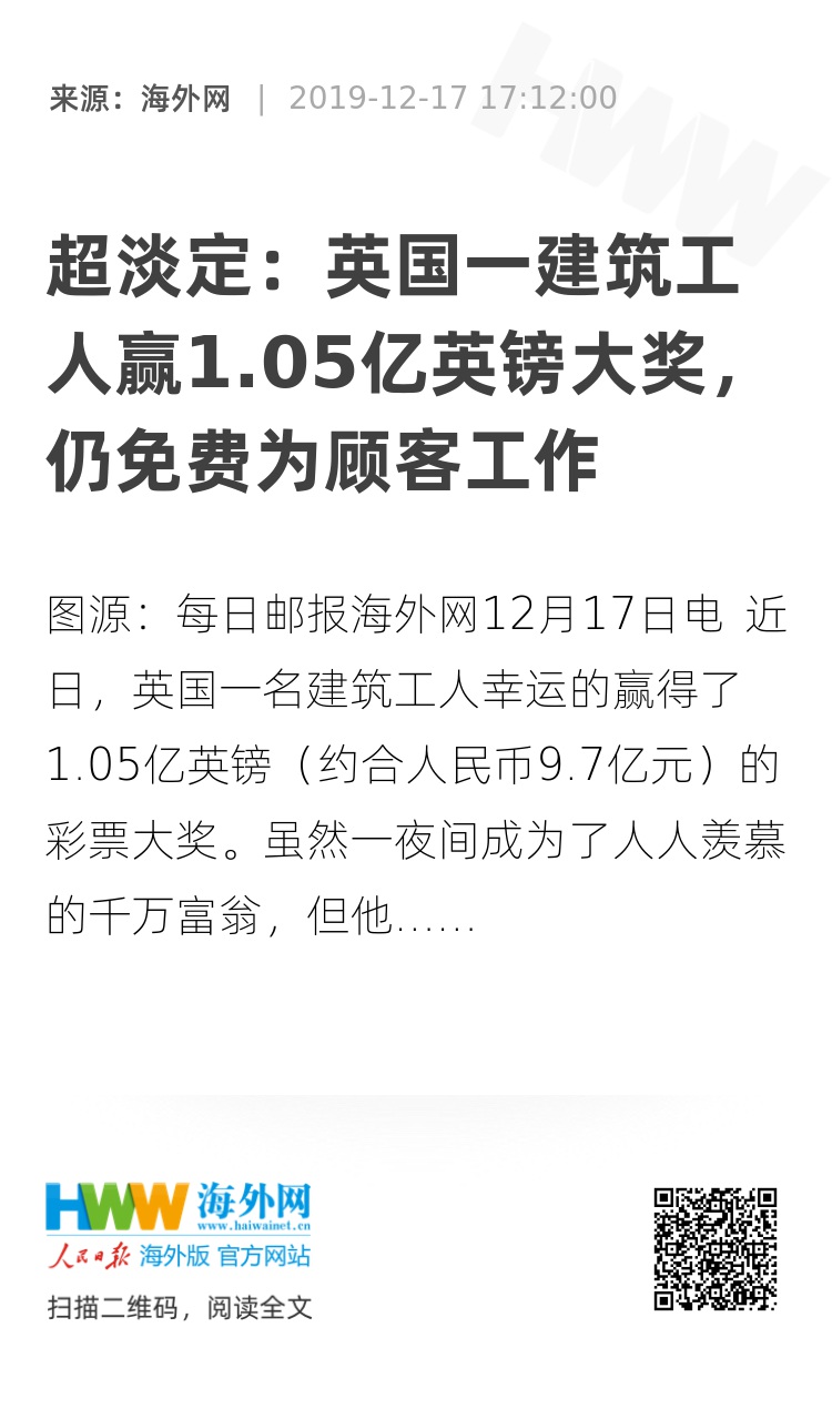 海外网12月17日电 近日,英国一名建筑工人幸运的赢得了1.05亿英镑(约合人民币9.7亿元)的彩票大奖。虽然一夜间成为了人人羡慕的千万富翁,但他却选择免费为顾客工作到圣诞节。