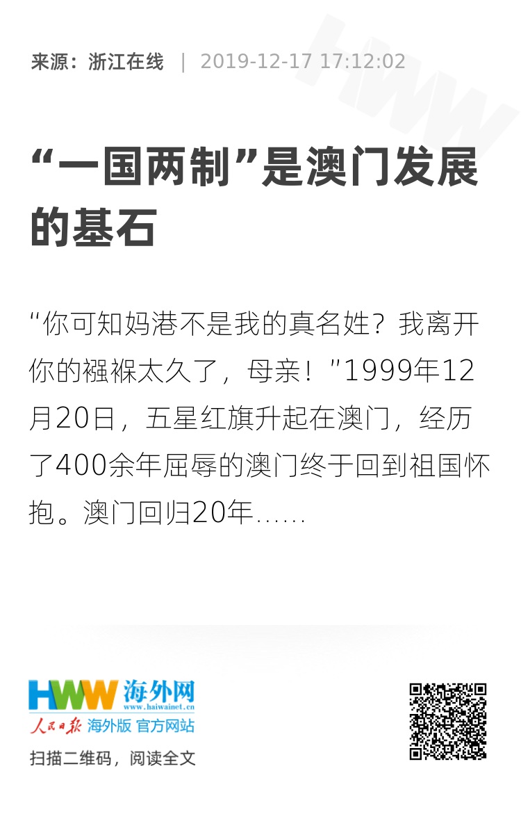 澳门回归祖国20年来,“一国两制”、“澳人治澳”、高度自治的方针在澳门得到了全面的贯彻和落实,在中央政府的大力支持和特区政府、社会各界的共同努力下,澳门取得了令人瞩目的发展成就,社会安定、经济发展、居民安居乐业,多元文化得到了很好的发展。澳门政通人和,成为“一国两制”成功实践的典范。