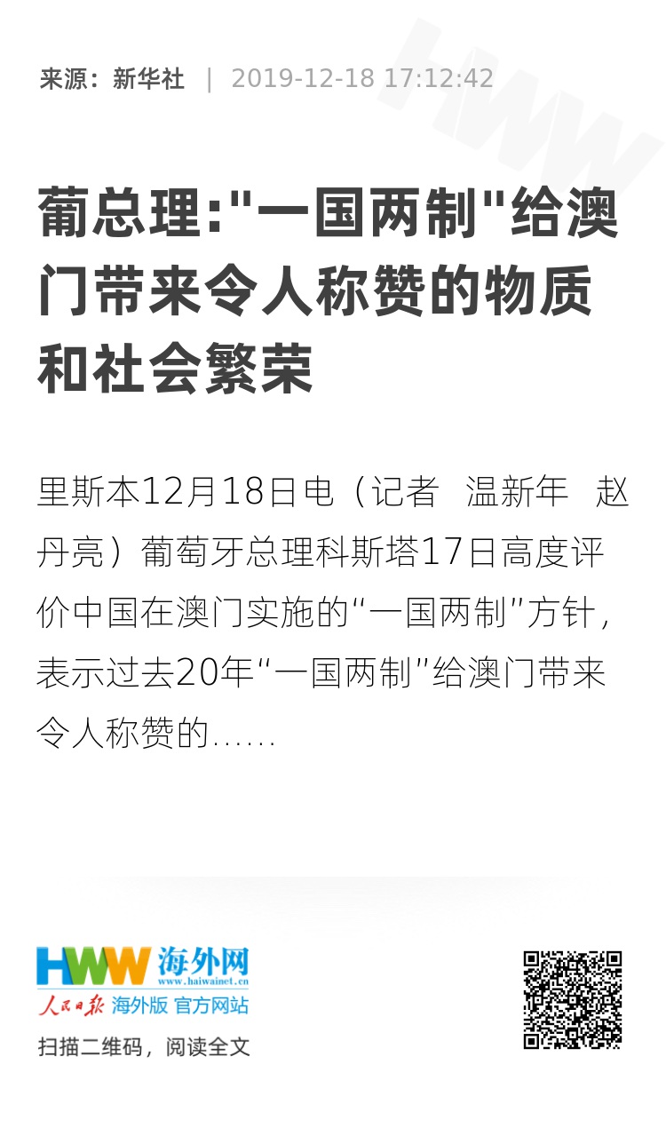 新华社里斯本12月18日电(记者 温新年 赵丹亮)葡萄牙总理科斯塔17日高度评价中国在澳门实施的“一国两制”方针,表示过去20年“一国两制”给澳门带来令人称赞的经济和社会发展成就。