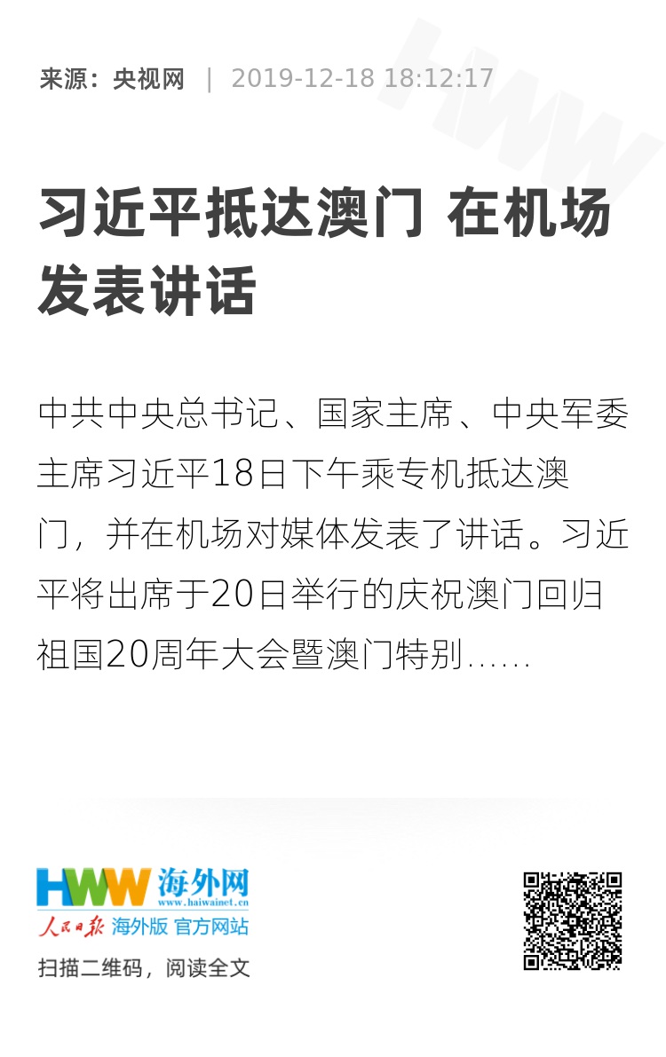 中共中央总书记、国家主席、中央军委主席习近平18日下午乘专机抵达澳门,并在机场对媒体发表了讲话。