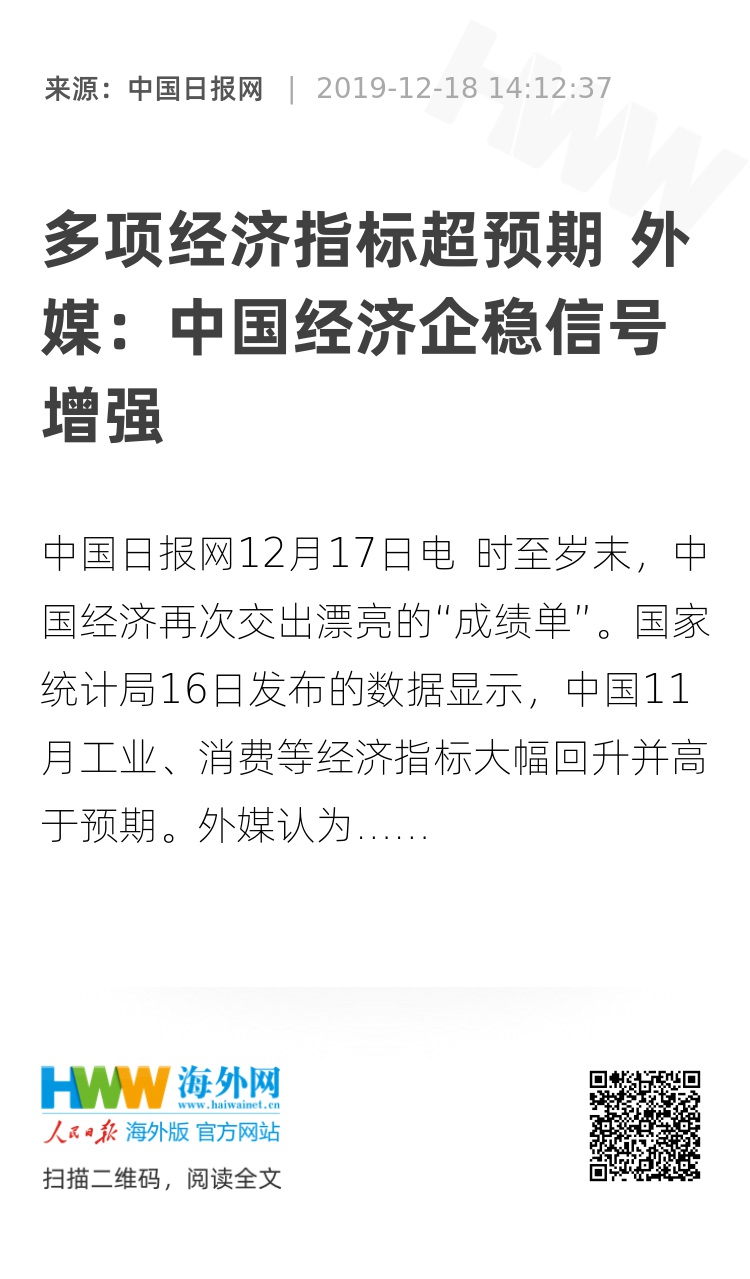 报道还指出,最新经济数据促使一些经济学家上调了对明年中国经济增速的预期。16日数据公布后,瑞银集团(UBS)和牛津经济研究院(Oxford Economics)的经济学家将其对2020年中国经济增速的预测从先前的5.7%的上调至6%。