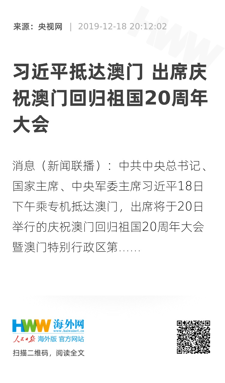 央视网消息(新闻联播):中共中央总书记、国家主席、中央军委主席习近平18日下午乘专机抵达澳门,出席将于20日举行的庆祝澳门回归祖国20周年大会暨澳门特别行政区第五届政府就职典礼并视察澳门。
