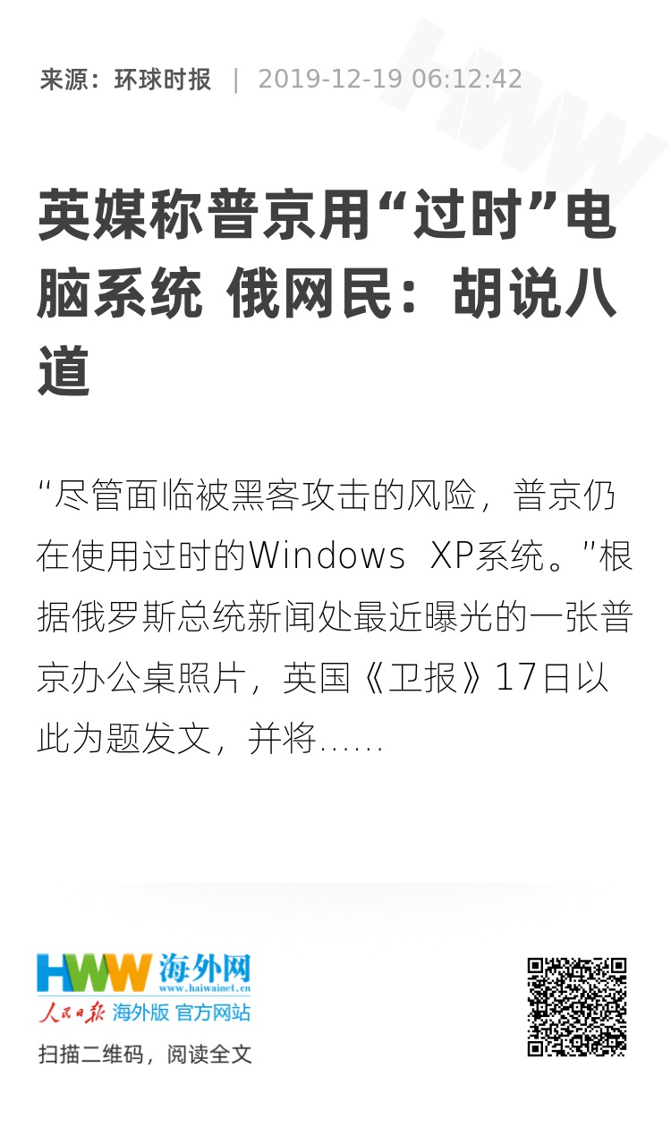 俄罗斯《晨报》18日报道称,俄罗斯国防部出口管制文件显示,2001年推出的Windows XP是俄罗斯允许政府机构计算机使用的最后一款微软操作系统。更新版的Windows 10系统只被批准用于不包含国家机密的电脑。微软已于2014年4月正式停止对Windows XP以及配套软件的技术支持,并提醒用户若继续使用该系统会更容易受到病毒攻击。克里姆林宫发言人佩斯科夫没有向媒体公开解释为什么克宫仍未更新普京电脑的操作系统。外媒猜测,俄罗斯政府对官员使用的外国软件进行了限制,可能是普京电脑没有更新系统的原因。报道称,目前尚不清楚普京的电脑使用Windows XP受到的网络安全威胁有多大。