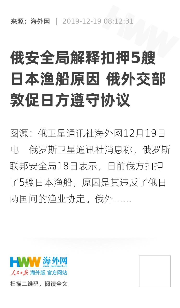 海外网12月19日电 俄罗斯卫星通讯社消息称,俄罗斯联邦安全局18日表示,日前俄方扣押了5艘日本渔船,原因是其违反了俄日两国间的渔业协定。俄外交部当日晚些时候也发声,敦促日方遵守协议。