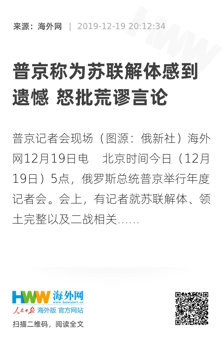 海外网12月19日电 北京时间今日(12月19日)5点,俄罗斯总统普京举行年度记者会。会上,有记者就苏联解体、领土完整以及二战相关等问题向普京提问。普京表示,自己为苏联解体感到遗憾,并当场怒批荒谬言论。