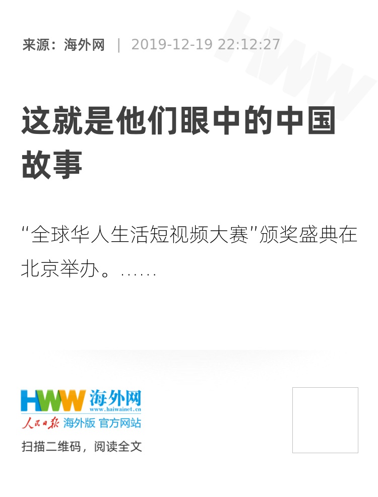 12月19日,由人民日报海外版指导,人民日报海外网主办的“全球华人生活短视频大赛”颁奖盛典在北京举办。人民日报海外网总经理、总编辑姚小敏在致辞中说:“本次大赛通过短视频形式,展现当下全球华人多元丰富的生活状况与精神风貌,记录中国发展变化,讲述中国故事。做好内容下沉很重要,百姓日常、农家耕作、田园稼穑,是乡愁情结,家国情怀,是中国故事的源头活水,可以穿透时空,直抵人心。”