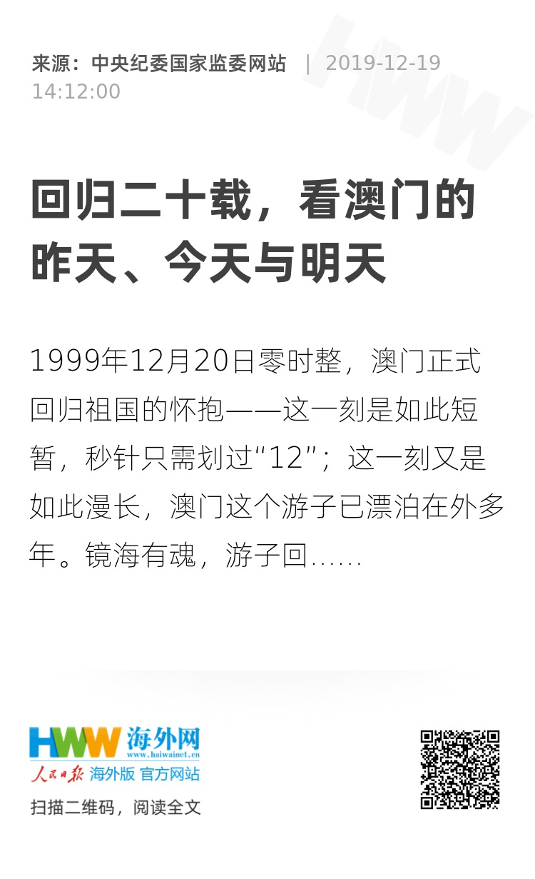 1999年12月20日零时整,澳门正式回归祖国的怀抱——这一刻是如此短暂,秒针只需划过“12”;这一刻又是如此漫长,澳门这个游子已漂泊在外多年。