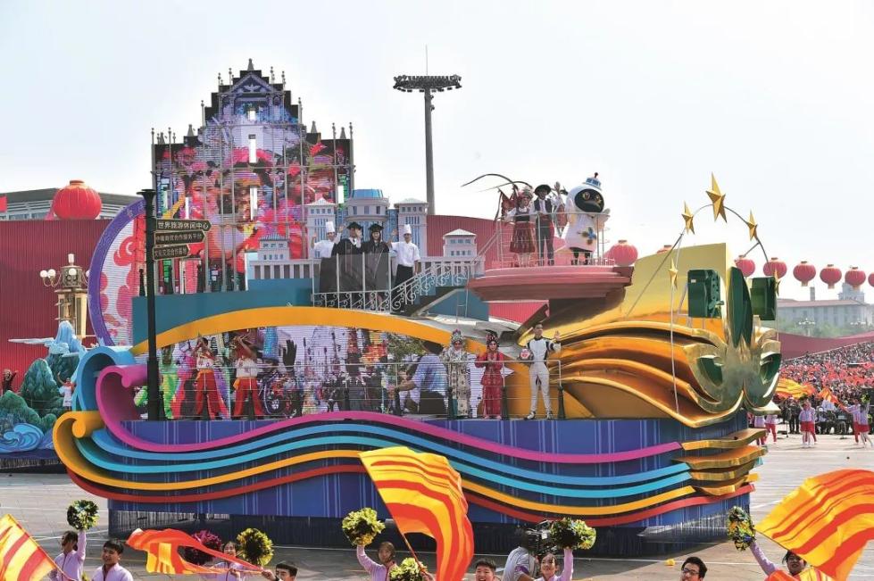 2019年10月1日上午,庆祝中华人民共和国成立70周年大会在北京天安门广场隆重举行。这是群众游行中的“莲花绽放”澳门彩车。
