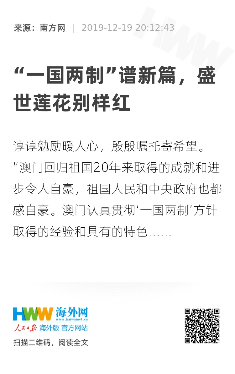 “一国两制”谱新篇,盛世莲花别样红。澳门即将迎来回归祖国20周年,特别行政区新一届政府也将正式就职,澳门的发展将进入新阶段、迈向新征程。我们相信,只要坚持“一国两制”初心,在中央政府一如既往的支持下,在特区政府强有力的领导下,澳门这朵灼灼绽放的“盛世莲花”,必将更加璀璨。(南方网乐兵)