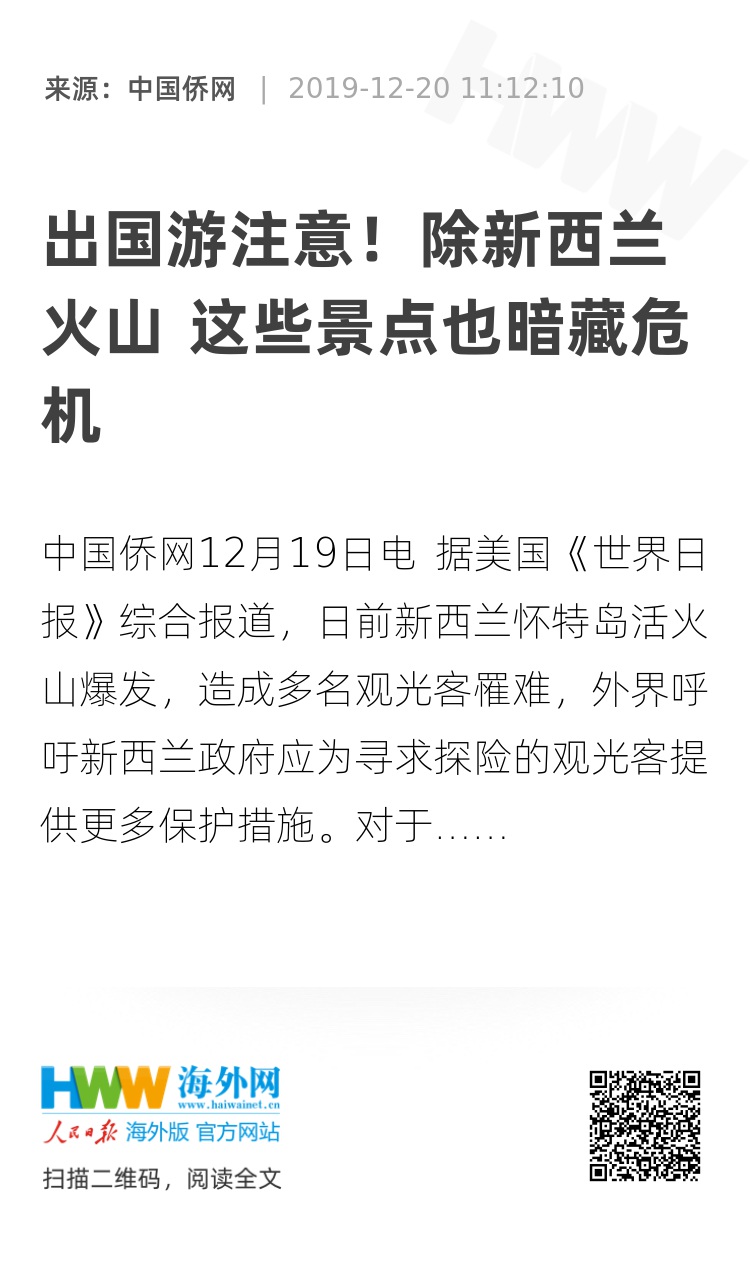 中国侨网12月19日电 据美国《世界日报》综合报道,日前新西兰怀特岛活火山爆发,造成多名观光客罹难,外界呼吁新西兰政府应为寻求探险的观光客提供更多保护措施。