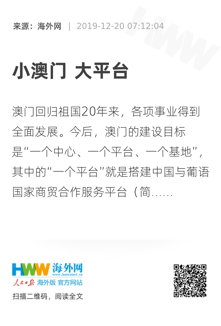 澳门回归祖国20年来,各项事业得到全面发展。今后,澳门的建设目标是“一个中心、一个平台、一个基地”,其中的“一个平台”就是搭建中国与葡语国家商贸合作服务平台(简称中葡平台)。