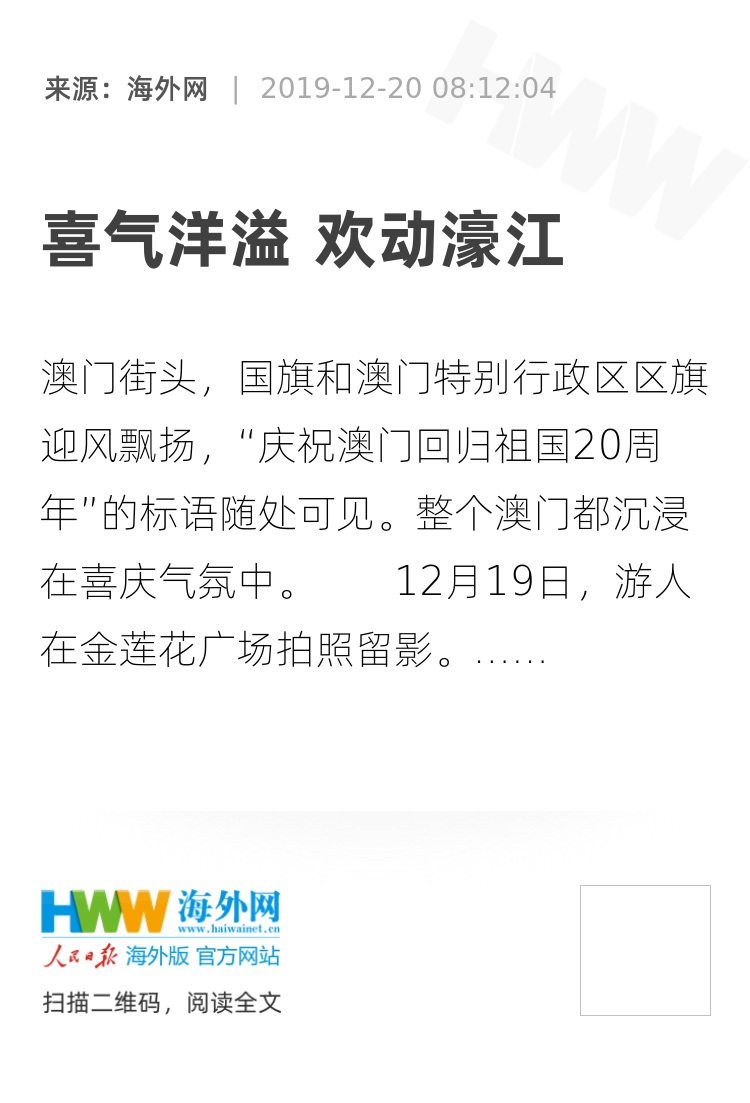 “你可知Macau,不是我真姓,我离开你太久了,母亲……”在离机场不远处颇具澳门风情的官也街,一场庆祝澳门回归祖国20周年的小型演出正在进行,澳门培正中学小学部四年级学生卢梓懿和学校合唱团的10多位同学面带微笑、手持绢制莲花,用稚嫩的童音唱起《七子之歌》。“澳门变得越来越好,我感到很开心。我想通过这首歌,把内心的开心与更多人分享。”卢梓懿说。