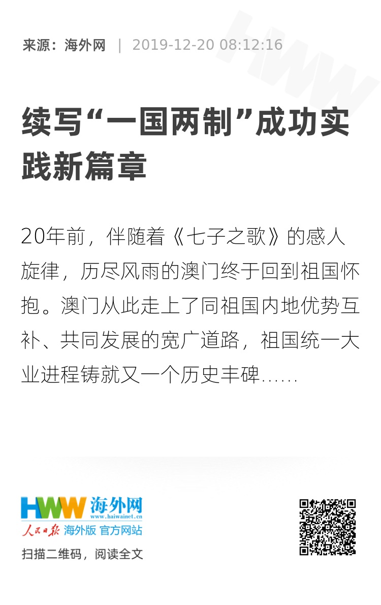 20年前,伴随着《七子之歌》的感人旋律,历尽风雨的澳门终于回到祖国怀抱。澳门从此走上了同祖国内地优势互补、共同发展的宽广道路,祖国统一大业进程铸就又一个历史丰碑。今天,濠江流彩,莲花盛放,一个生机勃勃、安定祥和的澳门正以崭新的姿态屹立在祖国的南海之滨。