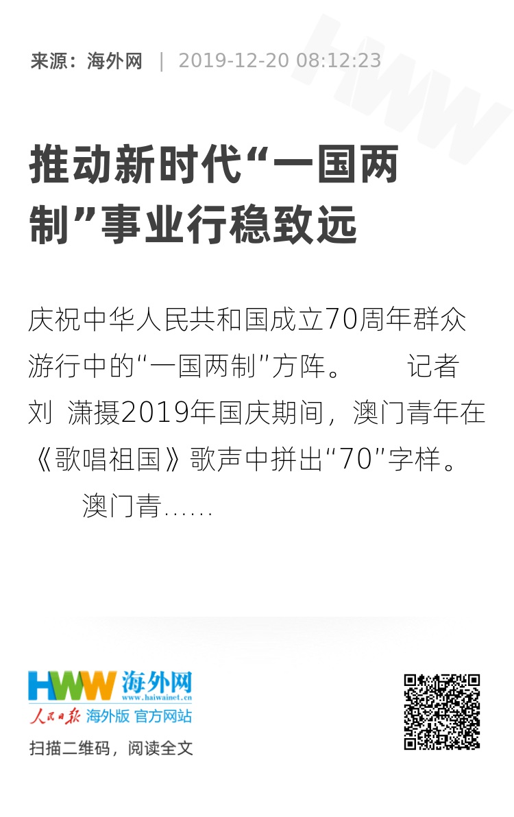 今年9月11日,习近平总书记在北京会见澳门特别行政区候任行政长官贺一诚时讲道:“20年来,在何厚铧、崔世安两位行政长官带领下,澳门特别行政区政府团结社会各界人士,全面准确理解和贯彻‘一国两制’方针,坚定维护宪法和基本法权威,传承爱国爱澳的核心价值观,促进澳门经济快速增长、民生持续改善、社会稳定和谐,向世界展示了具有澳门特色的‘一国两制’成功实践。事实证明,‘一国两制’是完全行得通、办得到、得人心的!”