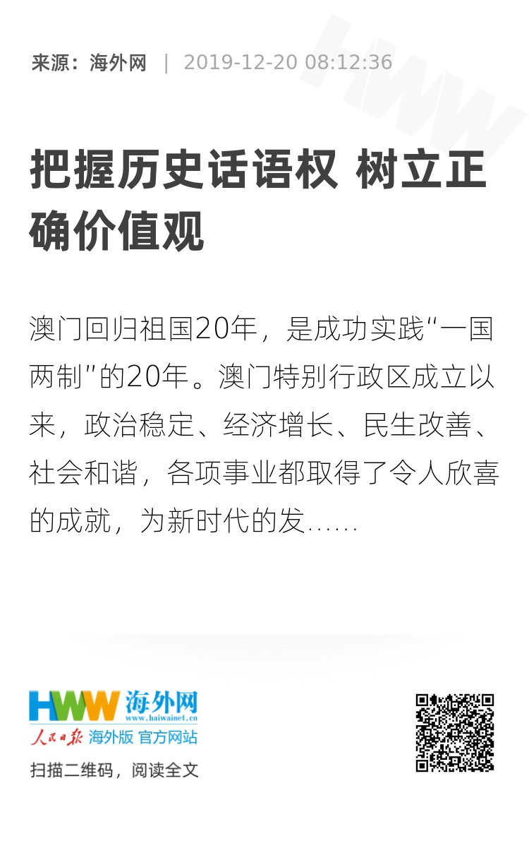 这是时代赋予我们的神圣使命,也是国家交付给我们的光荣职责。澳门文化、学术界不辱使命,不负重托,秉承爱国爱澳的优良传统,抓住千载难逢的机会,以极大的热情和强烈的现实关怀,投身于这个风云际会的时代,投入到澳门历史文化、政治社会和“一国两制”理论和实践的研究和探索中。从历史档案的挖掘整理到文化现象的深入研究,从政治形态的趋势探讨到社会实践的经验总结,孜孜以求,默默耕耘,探求澳门历史发展规律,了解澳门文化深厚底蕴,认识澳门社会特性,分析澳门经济发展模式、政治运作方式,阐释澳门与国家、澳门与世界的关系。20年后,我们发现,我们对这个城市有了更加深刻的了解和认识,对这块土地有了更加深厚的感情和眷恋,对澳门的历史价值和特别行政区在国家发展战略中的意义有了更加客观的评估,对中华文化和国家发展有了更多的自豪感,对世界有了更加清晰的视野。