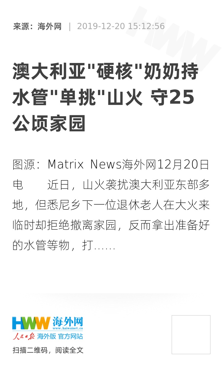 海外网12月20日电 近日,山火袭扰澳大利亚东部多地,但悉尼乡下一位退休老人在大火来临时却拒绝撤离家园,反而拿出准备好的水管等物,打算“硬刚”大火。