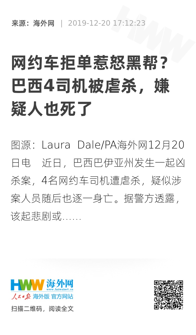 海外网12月20日电 近日,巴西巴伊亚州发生一起凶杀案,4名网约车司机遭虐杀,疑似涉案人员随后也逐一身亡。据警方透露,该起悲剧或源自一黑帮头目母亲叫车被拒。