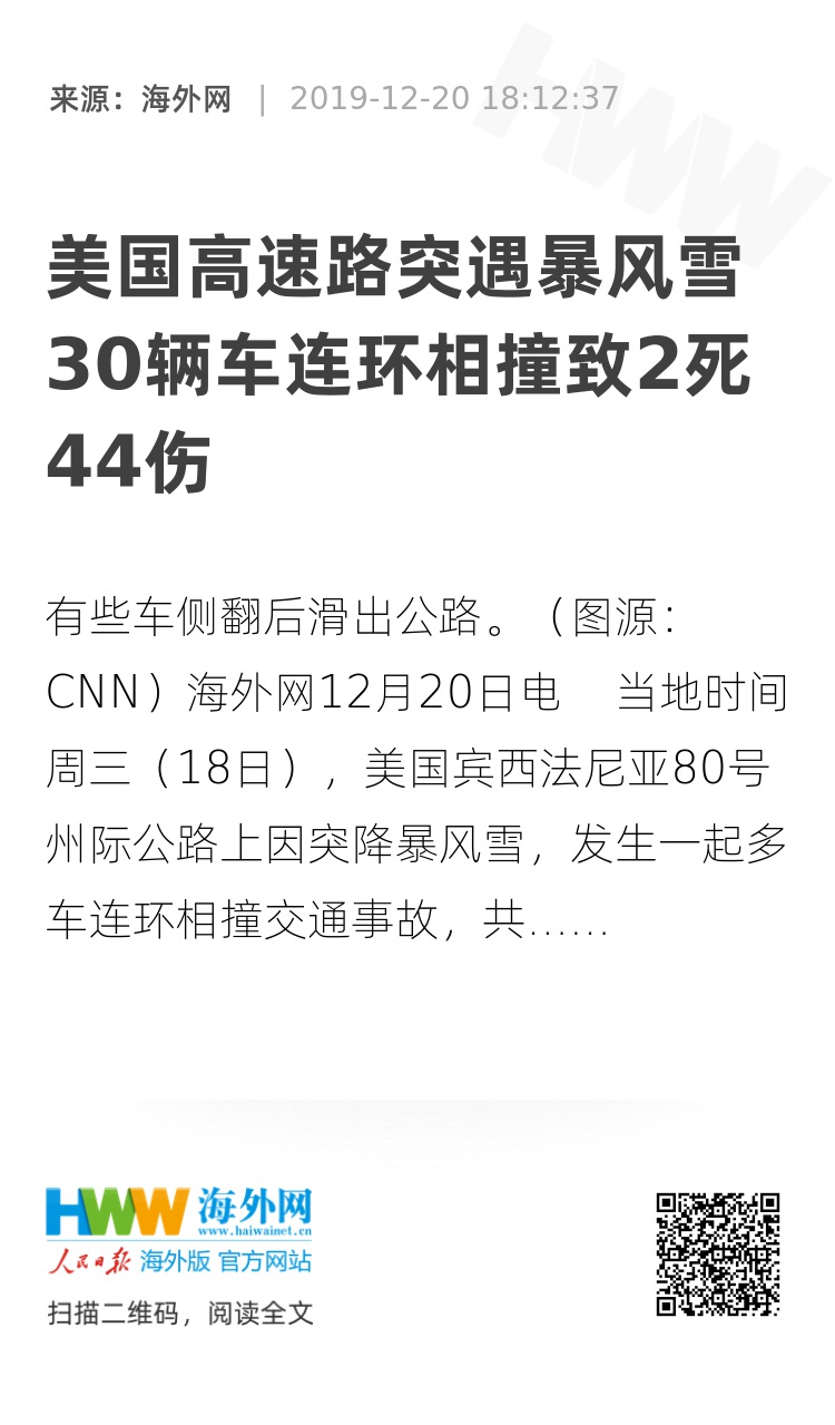 海外网12月20日电 当地时间周三(18日),美国宾西法尼亚80号州际公路上因突降暴风雪,发生一起多车连环相撞交通事故,共有30辆车追尾,造成2人死亡,至少44人受伤。