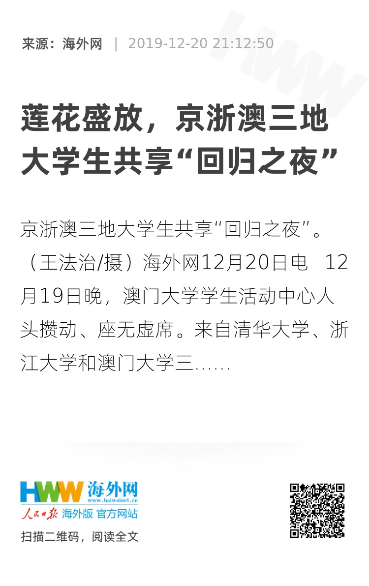 海外网12月20日电 12月19日晚,澳门大学学生活动中心人头攒动、座无虚席。来自清华大学、浙江大学和澳门大学三校学生齐聚一堂,载歌载舞共庆澳门回归祖国20周年。