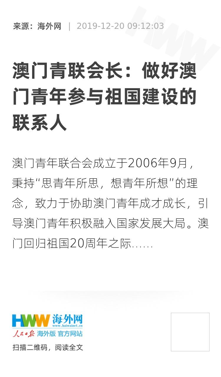 莫志伟:澳门青年联合会是青年人的平台,是澳门青年与社会、与特区政府之间的一座桥。在澳门融入国家发展大局的趋势下,我们尤其要做好澳门青年参与祖国建设的联系人。
