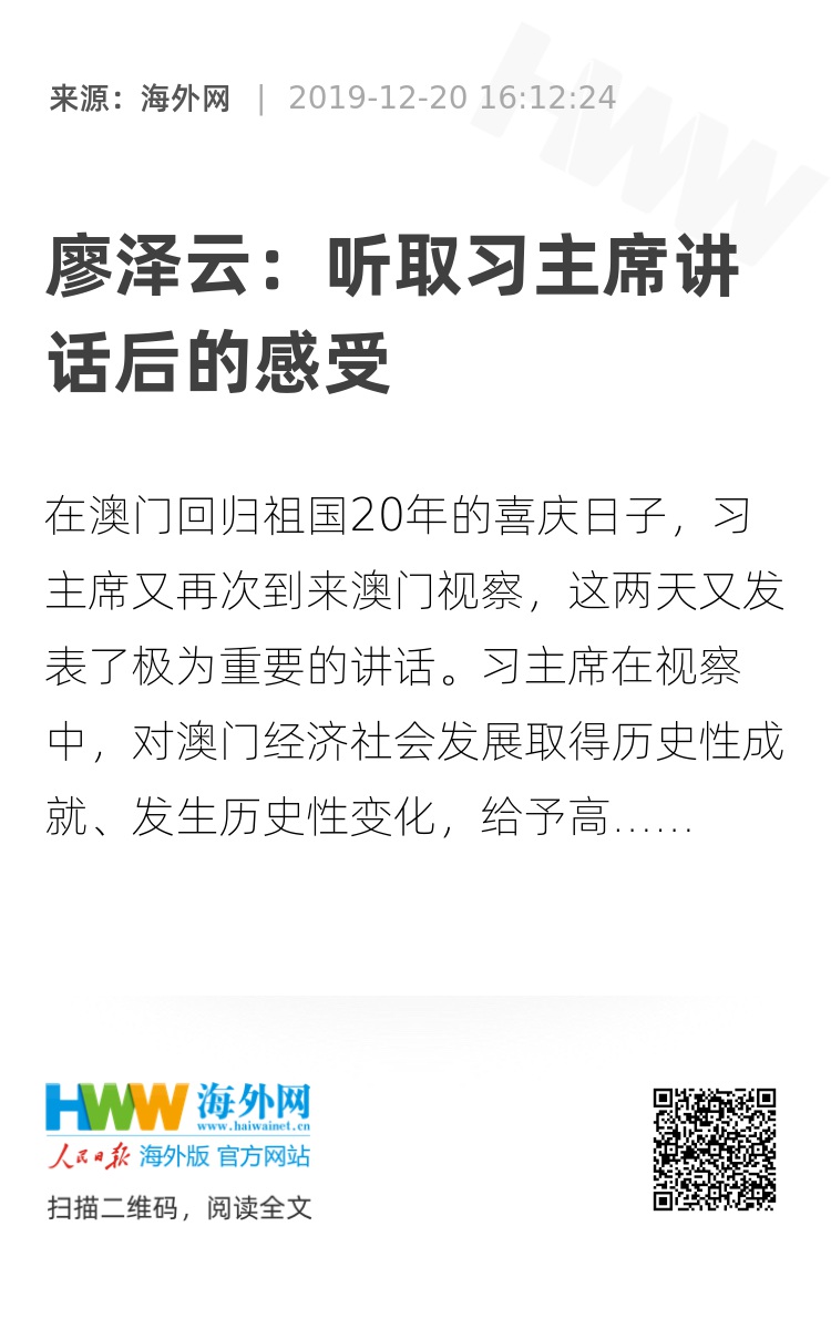 在澳门回归祖国20年的喜庆日子,习主席又再次到来澳门视察,这两天又发表了极为重要的讲话。习主席在视察中,对澳门经济社会发展取得历史性成就、发生历史性变化,给予高度的评价,指出澳门“小而富”“小而劲”“小而康”“小而美”,更表示“祖国人民和中央政府也都感到自豪”。习主席的肯定鼓励、深厚关怀、大力支持,让我和广大澳门同胞一样,深怀感激、深受鼓舞;习主席在讲话和视察中,对澳门推进“一国两制”新实践指明了努力方向,又提出了殷切期望,鼓励我们在新征途上,作出新作为。我必定会以身作则,带头认真学习习主席的重要讲话、深刻领会讲话的精神和内容,并将之积极贯彻于我们未来“一国两制”的新实践之中。