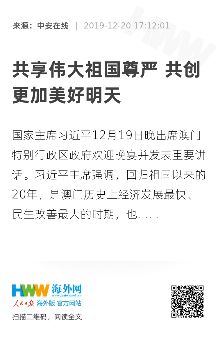 国家主席习近平12月19日晚出席澳门特别行政区政府欢迎晚宴并发表重要讲话。习近平主席强调,回归祖国以来的20年,是澳门历史上经济发展最快、民生改善最大的时期,也是澳门同胞共享伟大祖国尊严和荣耀感最强的时期。
