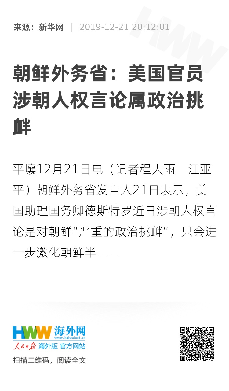 新华社平壤12月21日电(记者程大雨 江亚平)朝鲜外务省发言人21日表示,美国助理国务卿德斯特罗近日涉朝人权言论是对朝鲜“严重的政治挑衅”,只会进一步激化朝鲜半岛局势。