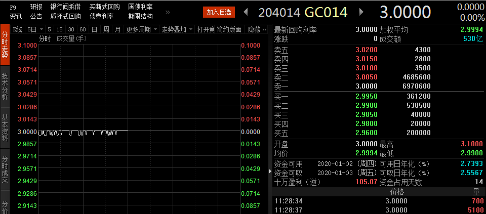 这是19日上交所14天国债回购收益走势——稳得没有一点跨年的样子。