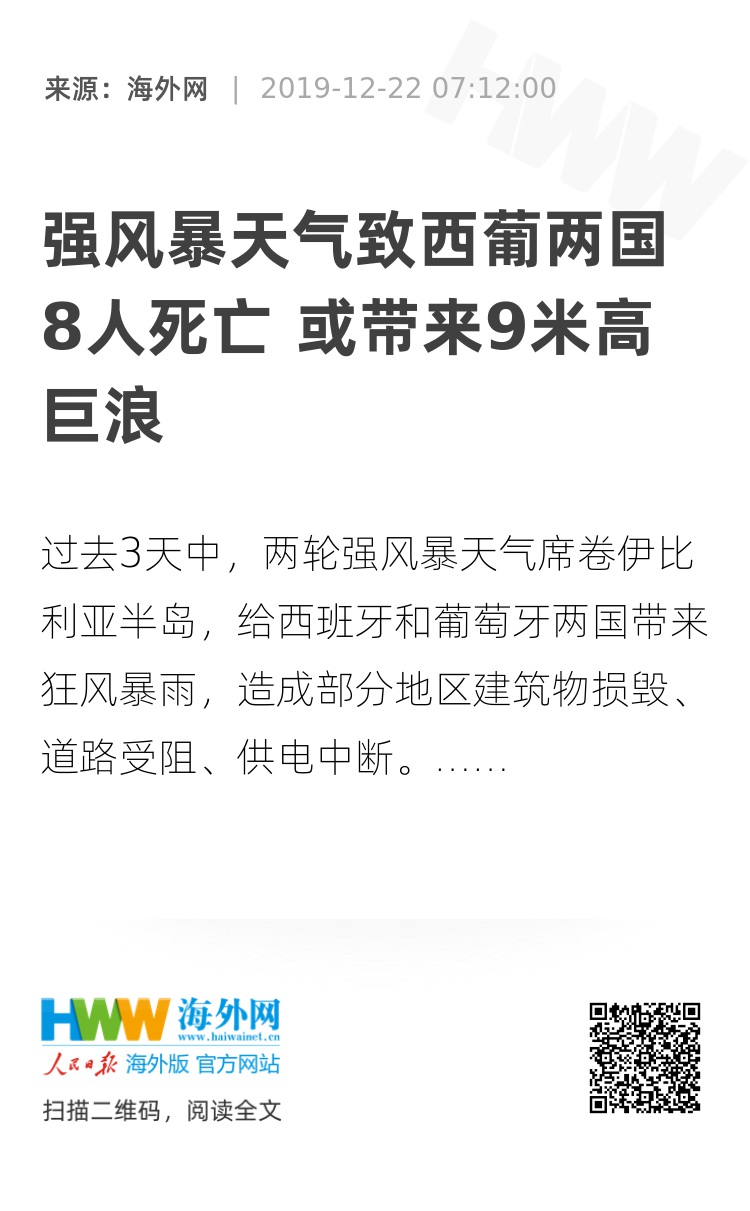 海外网12月22日电 过去3天中,两轮强风暴天气席卷伊比利亚半岛,给西班牙和葡萄牙两国带来狂风暴雨,造成部分地区建筑物损毁、道路受阻、供电中断。强风暴至少造成两国8人死亡,并造成洪水泛滥等严重破坏。