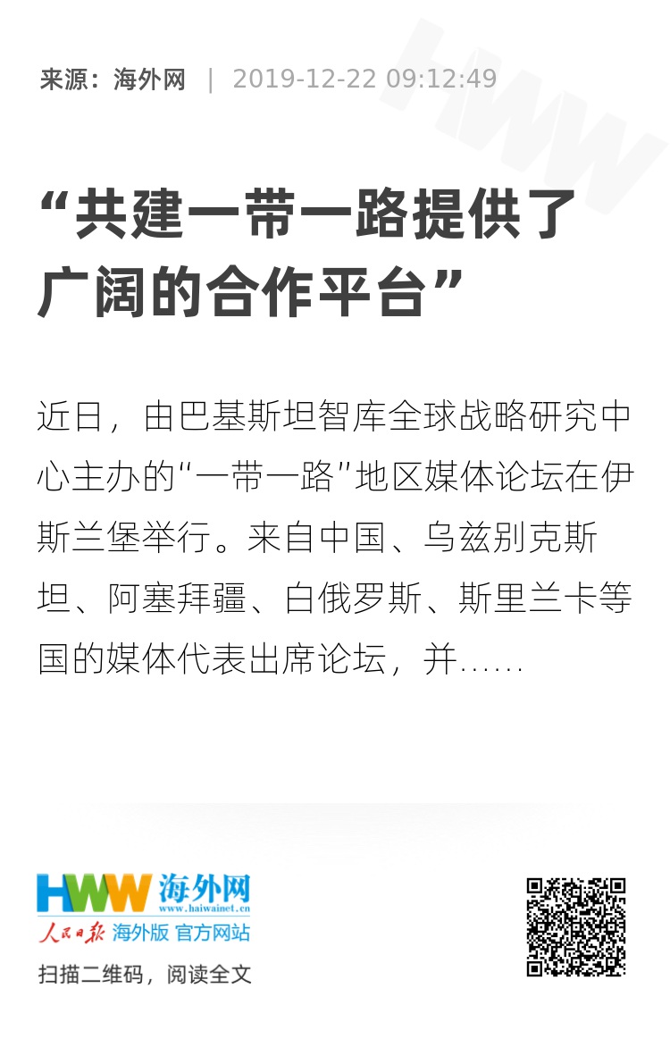 近日,由巴基斯坦智库全球战略研究中心主办的“一带一路”地区媒体论坛在伊斯兰堡举行。来自中国、乌兹别克斯坦、阿塞拜疆、白俄罗斯、斯里兰卡等国的媒体代表出席论坛,并实地探访了部分中巴经济走廊项目。巴基斯坦总理信息和广播事务特别顾问菲尔杜斯·阿万在论坛上表示,“一带一路”倡议是开放包容、面向全球的合作倡议,是多边合作的创新模式,创造了一种以各国互利共赢为基础的新型国际合作平台,有利于促进全球共同发展、共享红利。