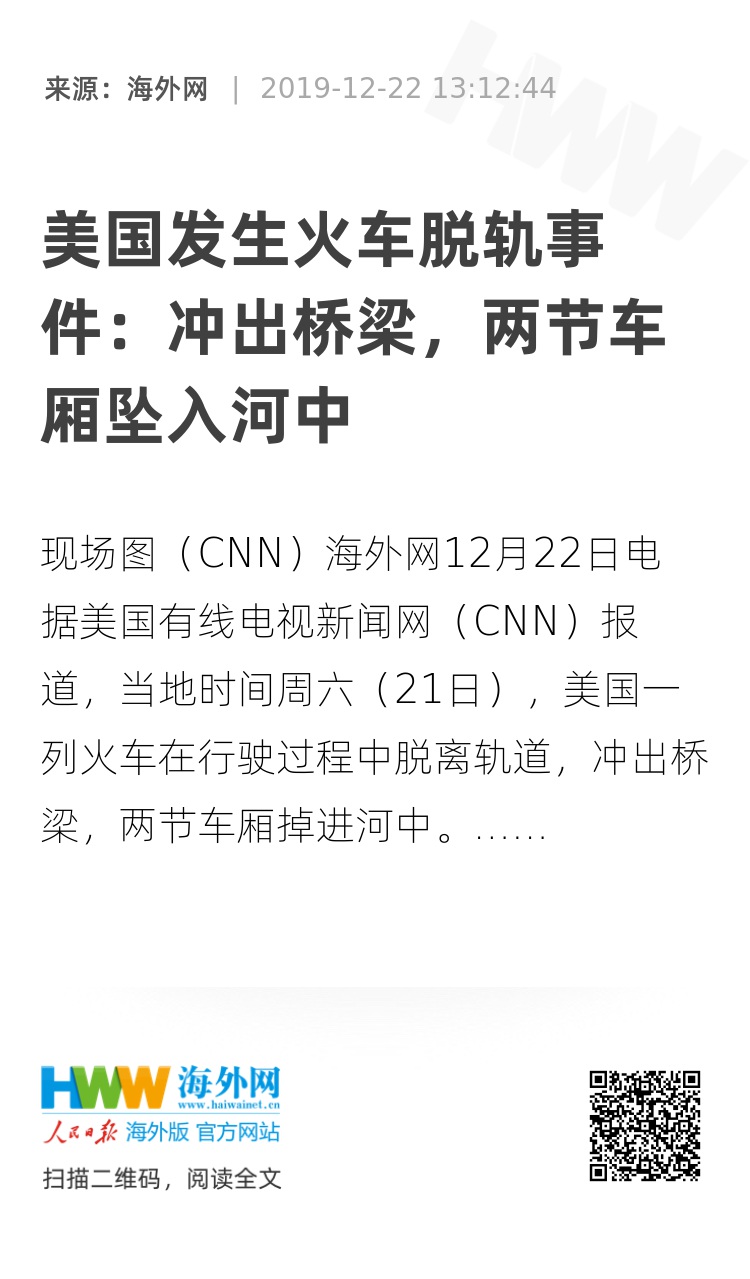 海外网12月22日电 据美国有线电视新闻网(CNN)报道,当地时间周六(21日),美国一列火车在行驶过程中脱离轨道,冲出桥梁,两节车厢掉进河中。