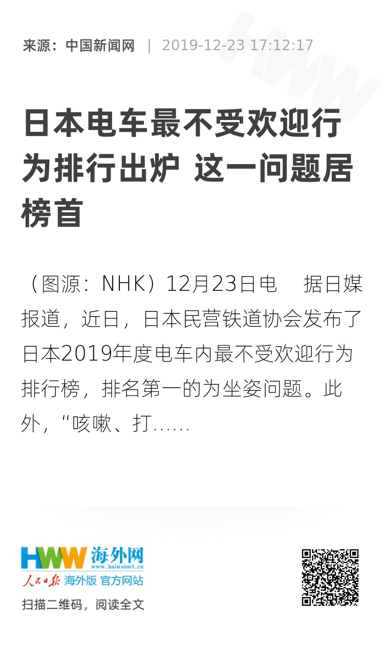 中新网12月23日电 据日媒报道,近日,日本民营铁道协会发布了日本2019年度电车内最不受欢迎行为排行榜,排名第一的为坐姿问题。此外,“咳嗽、打喷嚏”首次上榜,排名第六。