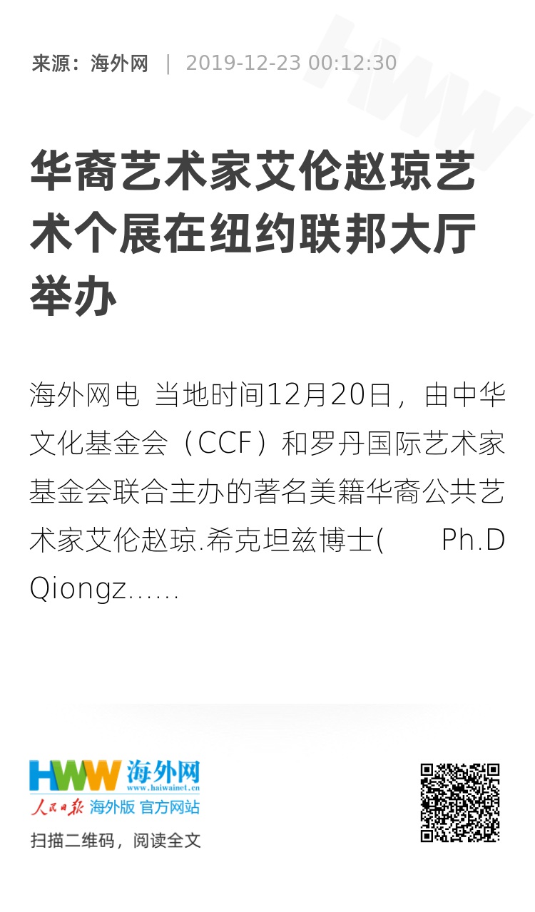 艾伦赵琼不仅是著名的艺术家、也是美中日文化艺术交流的传播者。30多年来,她往返于美国,中国,日本,参加国际艺术展览、组织多个学术会议,为中国、日本、美国的学者和艺术家之间搭桥筑路。(驻联合国记者李晓宏)