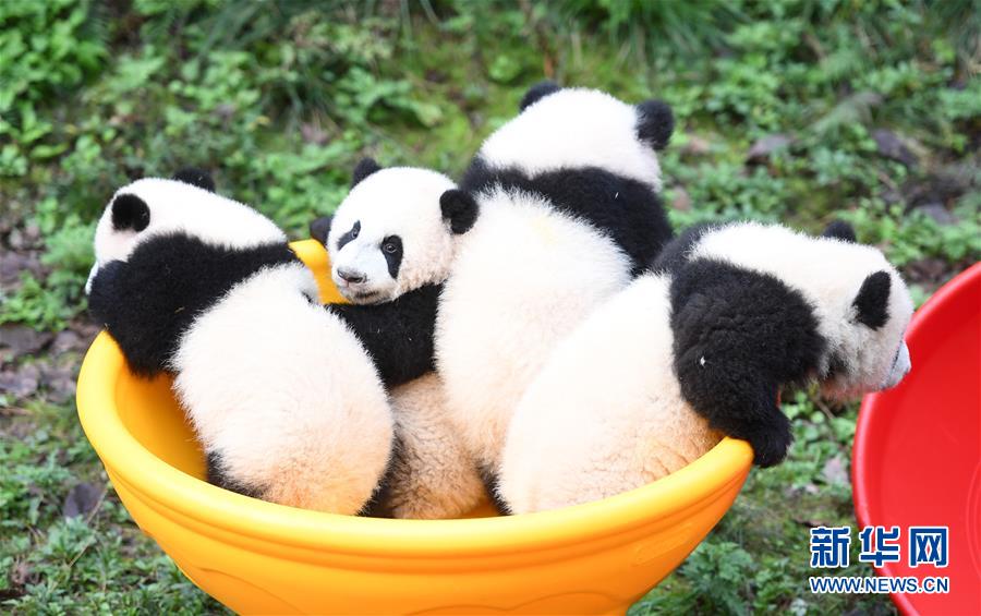 12月22日,重庆动物园为4只大熊猫宝宝“双双”“重重”“喜喜”“庆庆”举行半岁生日庆祝活动。4只半岁大熊猫在饲养员的照料下,在熊猫馆运动场内玩耍、嬉戏,与市民游客一同过冬至。 (新华社记者 唐奕 摄)