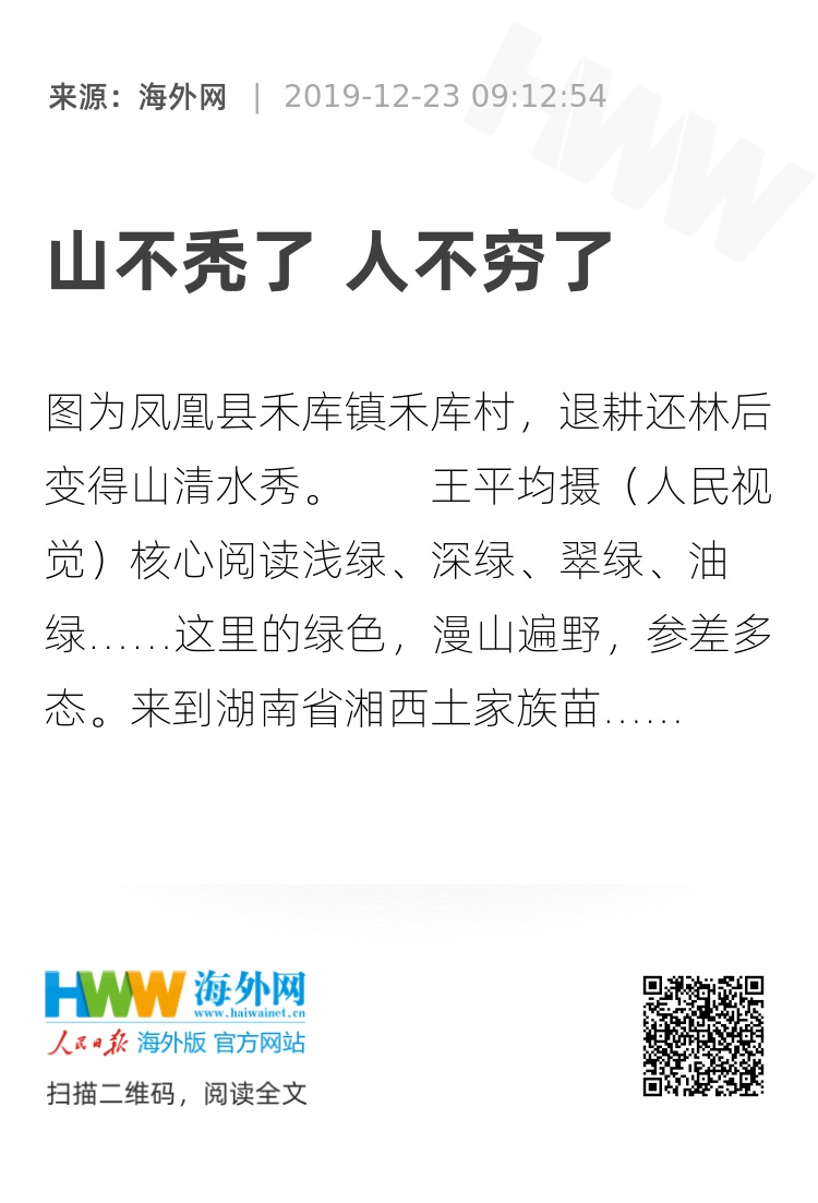 退耕还林近20年来,湘西州实现了从穷山恶水到绿水青山的蝶变,生态得改善、百姓拔穷根。2018年,湘西州林业产业总产值达到129.2亿元,全州接待游客5638.7万人次,实现旅游收入441亿元。“绿色产业已经成为湘西人民脱贫致富、过上幸福美好生活的支柱产业。”湘西州委副书记、州长龙晓华说,“我们将继续巩固退耕还林成果,让天蓝、地绿、水清成为湘西州最亮丽的名片。”