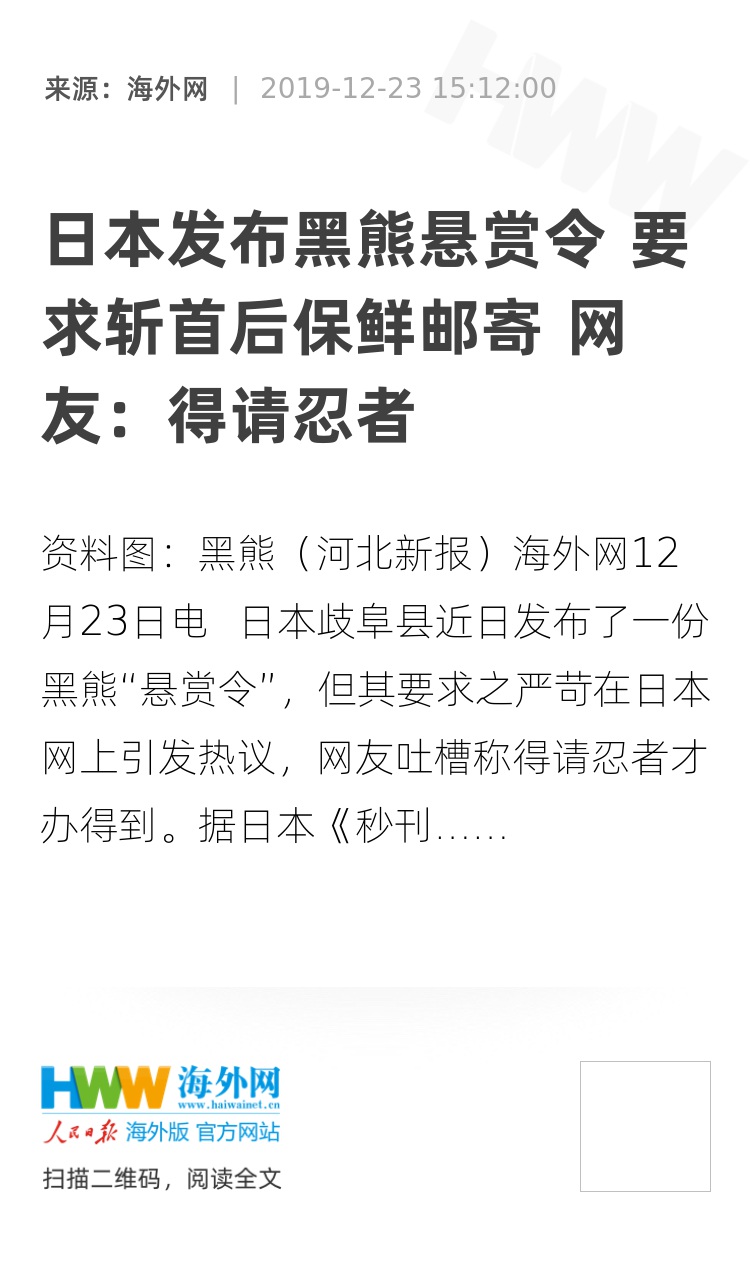 海外网12月23日电 日本歧阜县近日发布了一份黑熊“悬赏令”,但其要求之严苛在日本网上引发热议,网友吐槽称得请忍者才办得到。