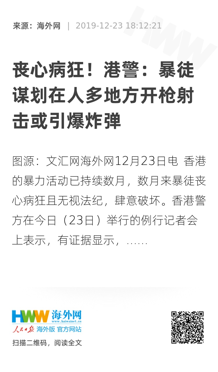 海外网12月23日电 香港的暴力活动已持续数月,数月来暴徒丧心病狂且无视法纪,肆意破坏。香港警方在今日(23日)举行的例行记者会上表示,有证据显示,有暴徒计划在集会游行等人多的地方使用致命武器,包括利用长枪在高位射击,以及在人多的地方引爆炸弹。