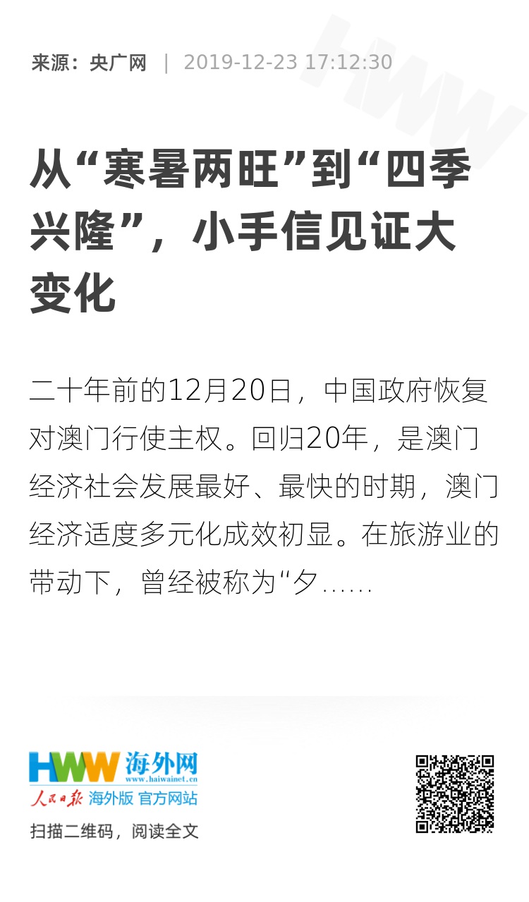 二十年前的12月20日,中国政府恢复对澳门行使主权。回归20年,是澳门经济社会发展最好、最快的时期,澳门经济适度多元化成效初显。在旅游业的带动下,曾经被称为“夕阳产业”的手信业如今飞速发展。